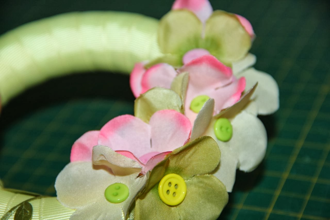 2. use glue dots to glue fabric flowers and buttons – it is better than pins mainly when you have so small wreath as I have, but you can use pins too