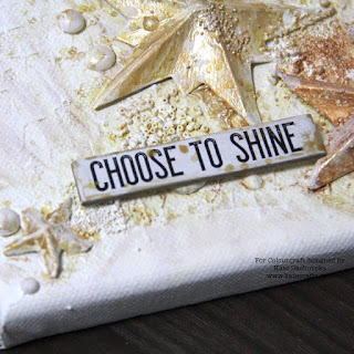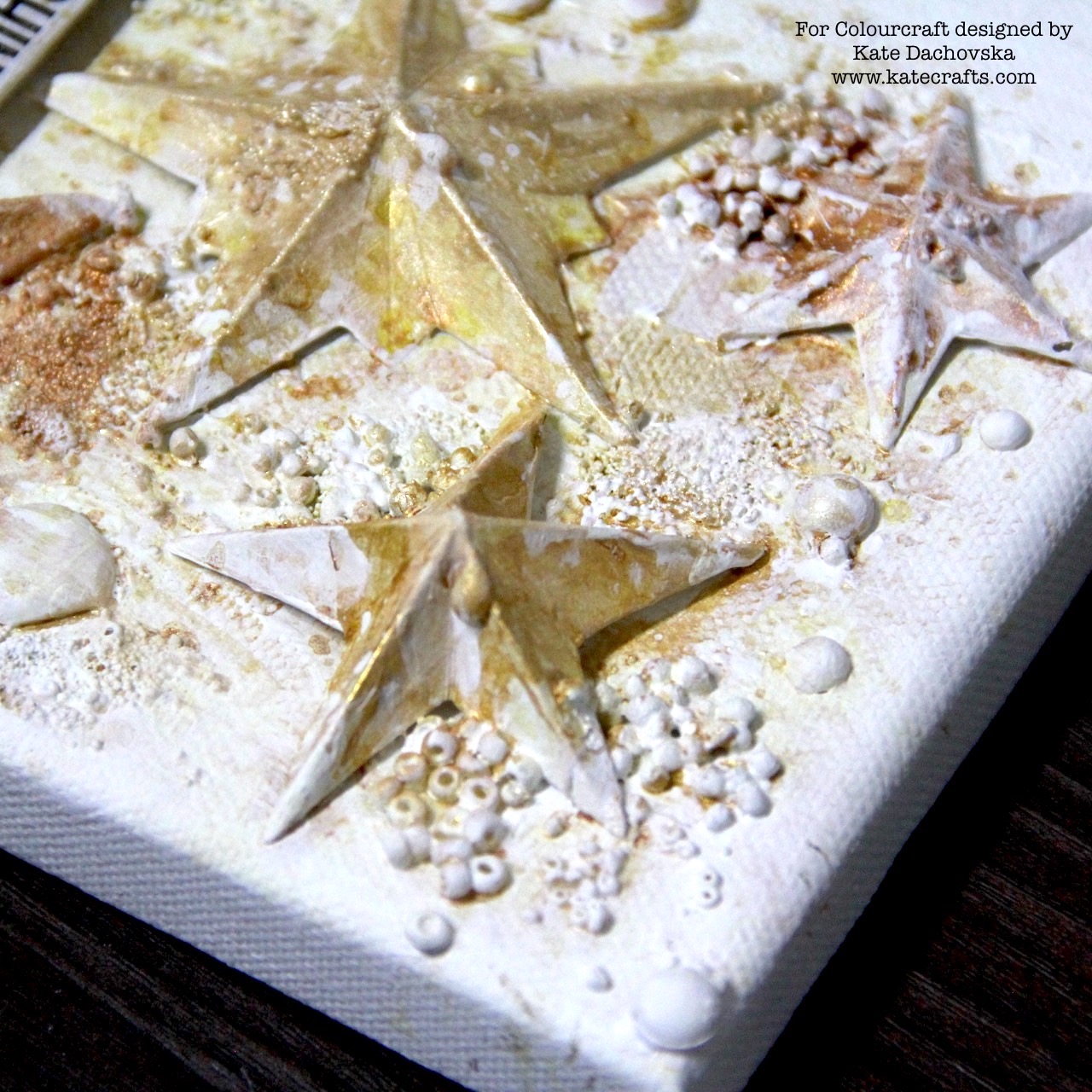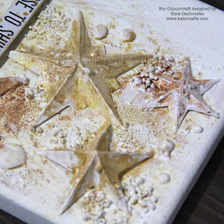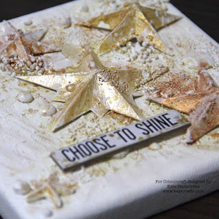 And here is my inspiration I made small canvas with minimum of material. I just die cut stars from watercolour heavy weight paper (Sizzix dies) and I glued them onto canvas. Than I played with art stones and micro beads and glue gun. When everything was dry I painted it with white gesso to prepare surface for colouring. It is always better when your background has got the same colour. For Colouring I used Aztec Eco Mettalic Lustre paints and Brusho Acrylic Sprays – Shimmering gold and copper. It is lovely shining canvas but as usually with shining bright metallic colours it is so hard to take nice photo, so I made many photos just to show you that shining effect. Sentiment is chipboard which I found in my stash.